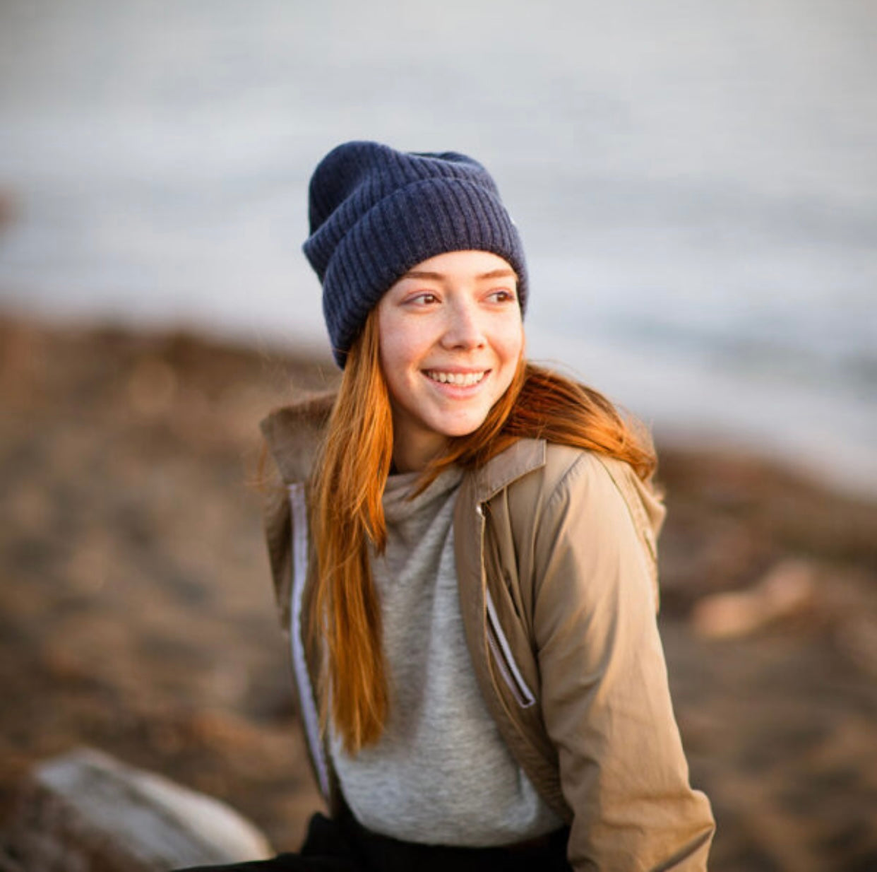 Our softest knit hat. This luxurious beanie is made with mercerized wool and cashmere. It has a wide rib and deep cuff with a soft, smooth hand. Unisex.