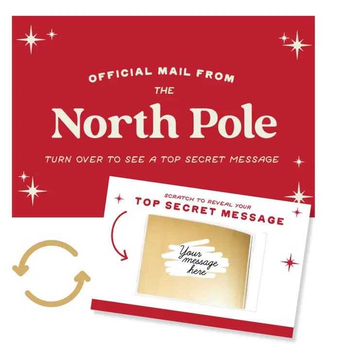 Perfect for writing little secret messages to kiddos, our Official North Pole Mail packs come with 24 x double sided cards and scratch and reveal stickers. - 4.5" x 3" Flat Card - Designed and Made in Canada - Packaged in a clear box HOW TO USE: 1. Hand write a message on the back of a card. 2. Cover the message with one of the scratch stickers provided. 3. Recipient will scratch the sticker off to reveal the message!