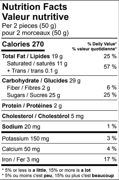 Chocolate (sugar, cocoa liquor, cocoa butter, whole milk powder, butter oil, sunflower lecithin, soy lecithin, natural vanilla), Peppermint candy (Sugars [sugar, corn syrup], peppermint oil, erythrosine, allura red, brilliant blue FCF, palm oil), Natural peppermint flavour.