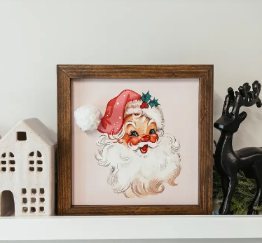 Vintage Santa with Pom Pom Hat Framed Wooden Sign