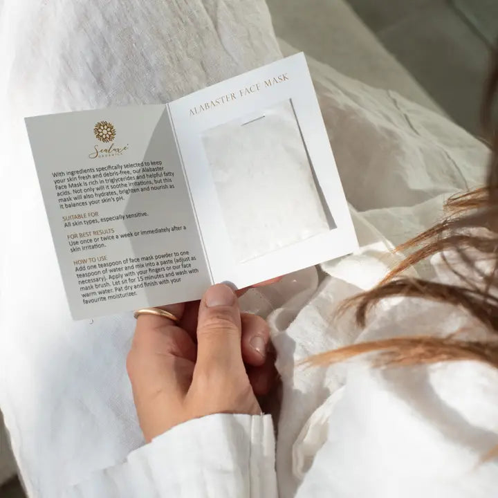 Harnessing the power of the sea, our Alabaster Mask is packed with over 60 micronutrients, including a rich array of vitamins, minerals, amino acids, essential fatty acids, enzymes, and antioxidants. This mask naturally supports skin health and balance. Seaweed and Moringa Leaf Powder replenish vital minerals, enhancing your skin's tone and texture, while Ascorbic Acid and Zinc Oxide provide powerful antioxidant benefits, boosting circulation and calming inflammation to reduce puffiness. Embrace the natural power of our mask for deeply cleansed, hydrated, and glowing skin. INGREDIENTS: Kaolin, Bentonite, Chondrus Crispus Powder, Moringa Oleifera Leaf Powder, Ascorbic Acid, Zinc Oxide.