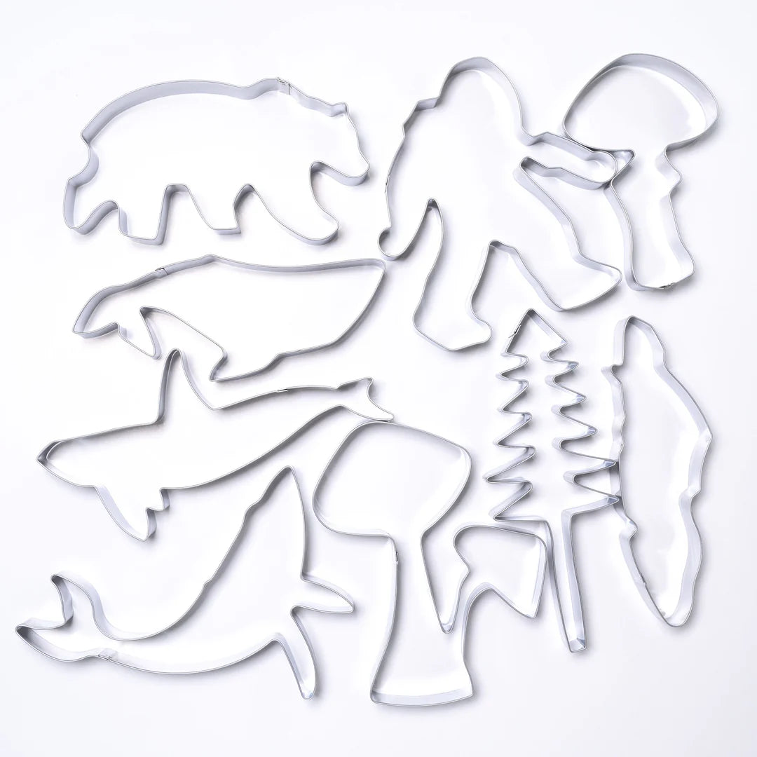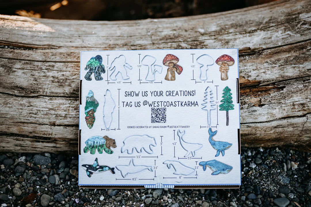 Kit includes 9 different West Coast shapes including- Humpback Whale, Baby Humpback Whale, Orca Whale, Sasquatch, Amanita Mushroom, Double Mushroom, Bear, Tree and Vancouver Island map.
